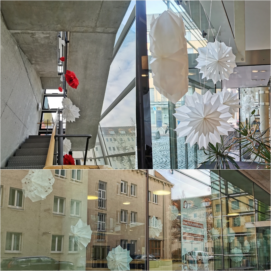 Zudem wurde die Hauptbibliothek mit Papiersternen winterlich geschmückt und macht einen Aufenthalt in unserem warmen Räumlichkeiten bei den vorherrschenden kalten Temperaturen hoffentlich noch angenehmer und einladener, um einen gemütlichen Platz zum Arbeiten und Lernen zu finden.